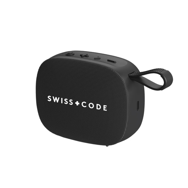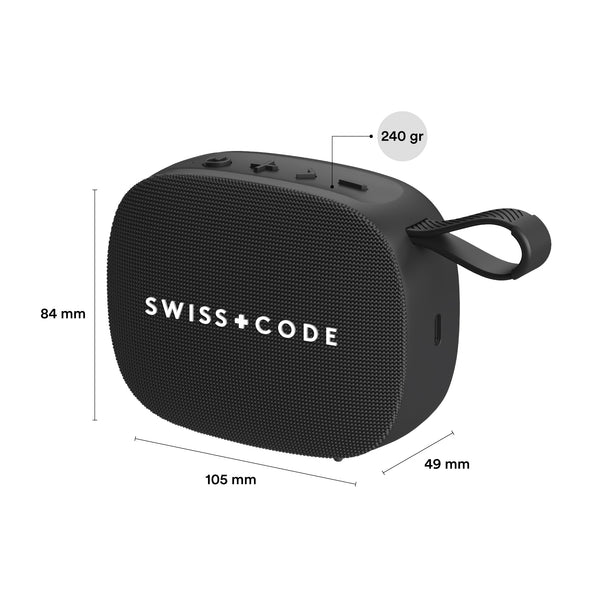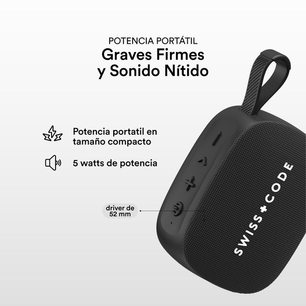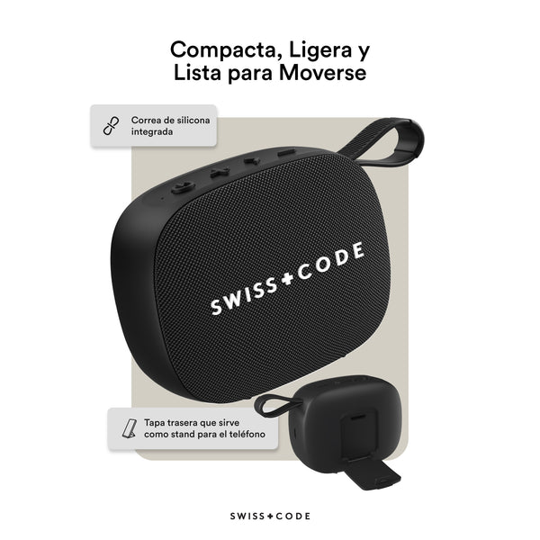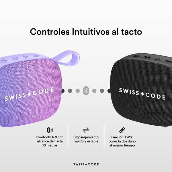 ¿POR QUÉ SWISS CODE SERO? Juno ofrece graves firmes y sonido nítido en un diseño compacto con controles táctiles. Tiene batería de 1200 mAh para hasta 15 horas de reproducción, resistencia a salpicaduras IPX4 y correa de silicona para llevarla fácilmente.