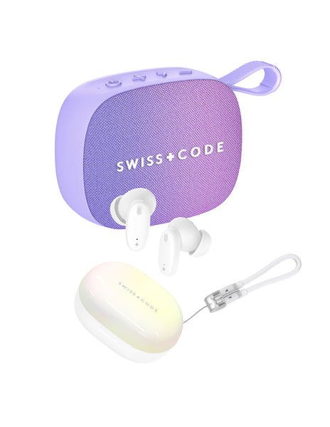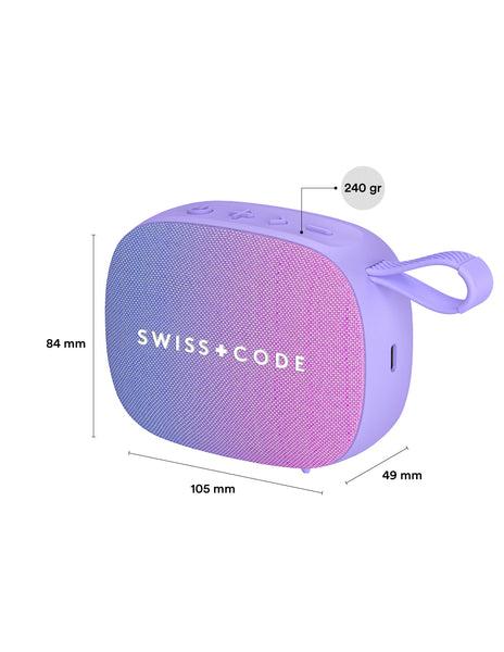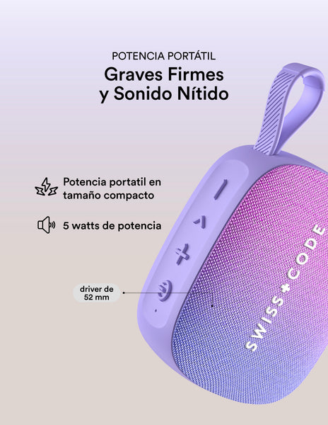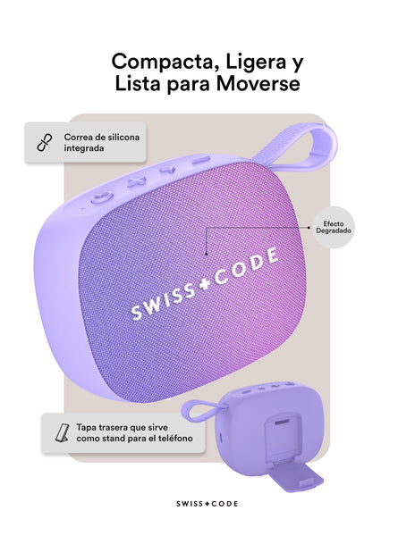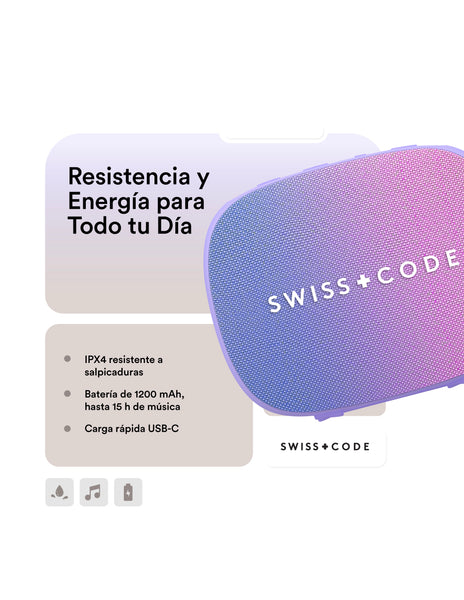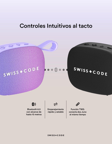 ¿POR QUÉ SWISS CODE JUNO? Juno ofrece graves firmes y sonido nítido en un diseño compacto con controles táctiles. Tiene batería de 1200 mAh para hasta 15 horas de reproducción, resistencia a salpicaduras IPX4 y correa de silicona para llevarla fácilmente.