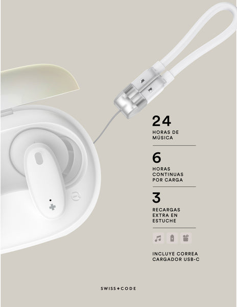 LLAMADAS NÍTIDAS: Con 4 micrófonos, tus llamadas serán siempre claras. Ofrece hasta 6 horas por carga y 24 horas totales con su estuche. Es resistente a salpicaduras e incluye una correa-cable USB-C para cargar los audífonos o cualquier dispositivo, incluso desde la batería de tu teléfono.